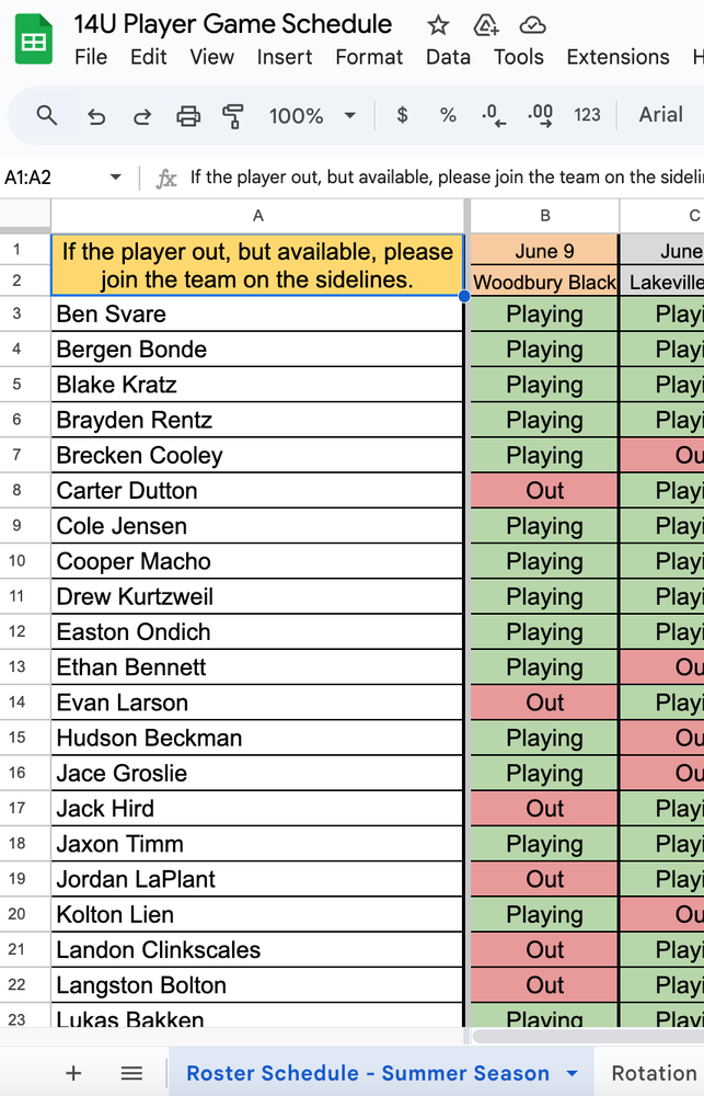 📑 Logging rotation and fill in: Please make sure you’re referencing the first two tabs of the spreadsheet. (Roster Schedule - Summer Season and Rotation). Before people start filling in a second time, we want to give everyone a chance. If none of the first-timers are available to fill in, we’ll then open it up to those who have already filled in once.